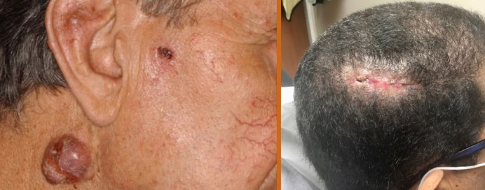 Skin cancers affecting the scalp, face, and neck are often a result of prolonged sun exposure. The three main types are basal cell carcinoma (BCC), squamous cell carcinoma (SCC), and melanoma. BCC is the most common and typically appears as a shiny bump, while SCC may present as a scaly patch or a rapidly growing lump. Melanoma, the most serious type, often manifests as an irregular mole with uneven borders and varying colors. Early detection is vital for successful treatment, which may involve surgery, radiation, or immunotherapy. Regular skin checks, sun protection, and prompt medical attention for suspicious changes can aid in preventing and managing skin cancers in these areas.